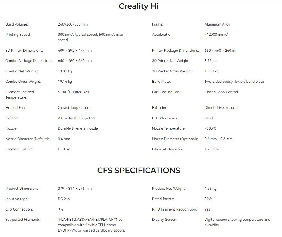 Creality Hi only 3D printer, CFS is not included. Hi Combo includes a CFS.